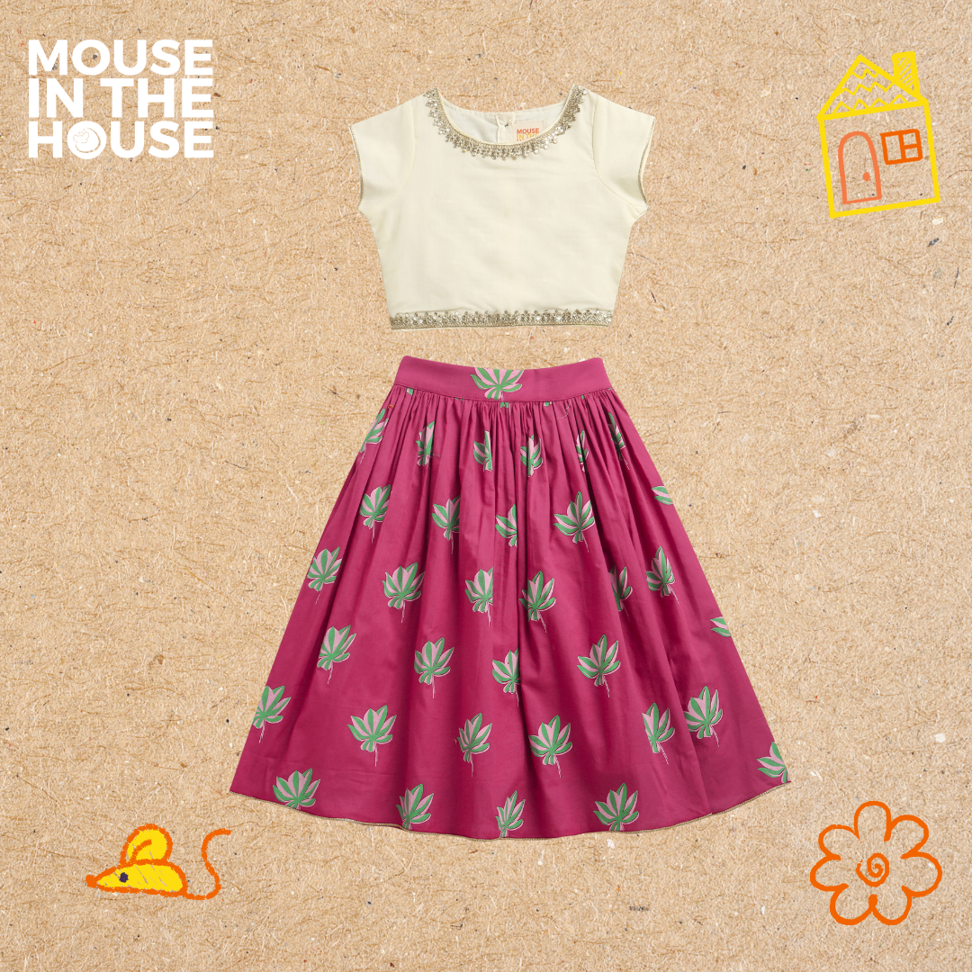 A charming ghagra choli set in an all-over lotus print, crafted in soft breathable cotton for all-day comfort. Designed for easy movement and festive flair, it’s perfect for celebrations, weddings, and special occasions — where little ones can dress up and still play freely.